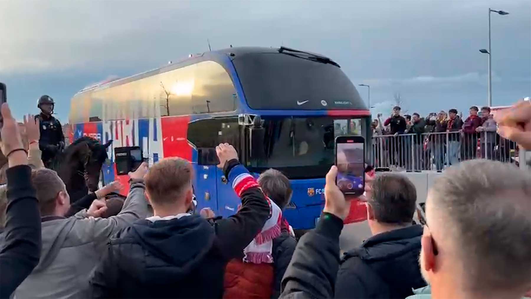 El autobús del Barcelona, por una entrada distinta al del Atlético de Madrid, llegó puntual, algo antes que el colchonero. Y lo hizo con decenas de hinchas del equipo culé esperándolo. «¡Barça, Barça!!», cantaban al unísono. Ningún pito de la hinchada rojiblanca al equipo rival. Sin insultos. Nada. Todo cordialidad. El Barcelona, parecía, que jugaba en casa.