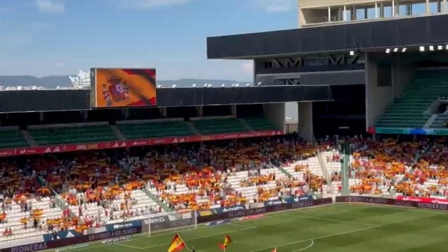 Córdoba es una fiesta: la afición tiñe las gradas del Arcángel con banderas durante el himno de España