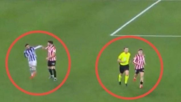 El jugador de la Real tiene una pequeña disputa con Paredes, defensa del Athletic, y el jugador local se tira al suelo simulando un golpe en la cara. Realmente Brais apenas le da, pero al jugador rojiblanco le funcionó la jugada. Las cámaras de la Liga reflejaron como Cuadra Fernández en esa jugada no ve la acción. Estaba mirando a otro lado de espaldas a la polémica acción.