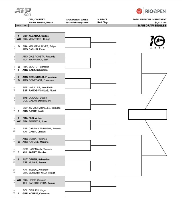 El torneo ATP de Río de Janeiro ya tiene su cuadro final designado y con él, el primer escollo para Carlos Alcaraz, así como todos los rivales que se puede encontrar en su camino potencial el tenista español, primer cabeza de serie y principal favorito para conquistar el torneo brasileño. No será un periplo fácil, pero sí propicio para que Alcaraz se reencuentre con su mejor tenis y pueda levantar el primer título de 2024.