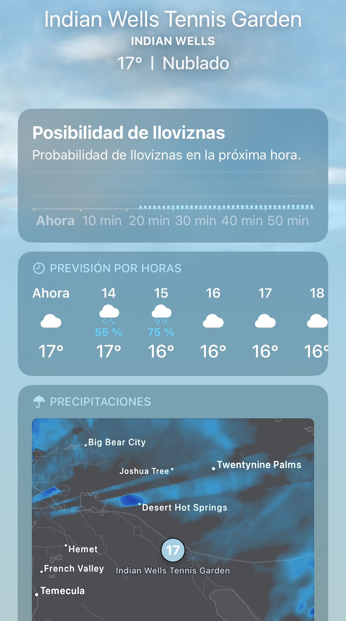 Esta es la previsión de lluvia para las próximas horas en el Masters 1000 de Indian Wells. Recordemos que el partido que mide a Carlos Alcaraz y a Jannik Sinner está aplazado por este motivo y los jugadores se marchan a vestuarios. PARTIDO SUSPENDIDO.