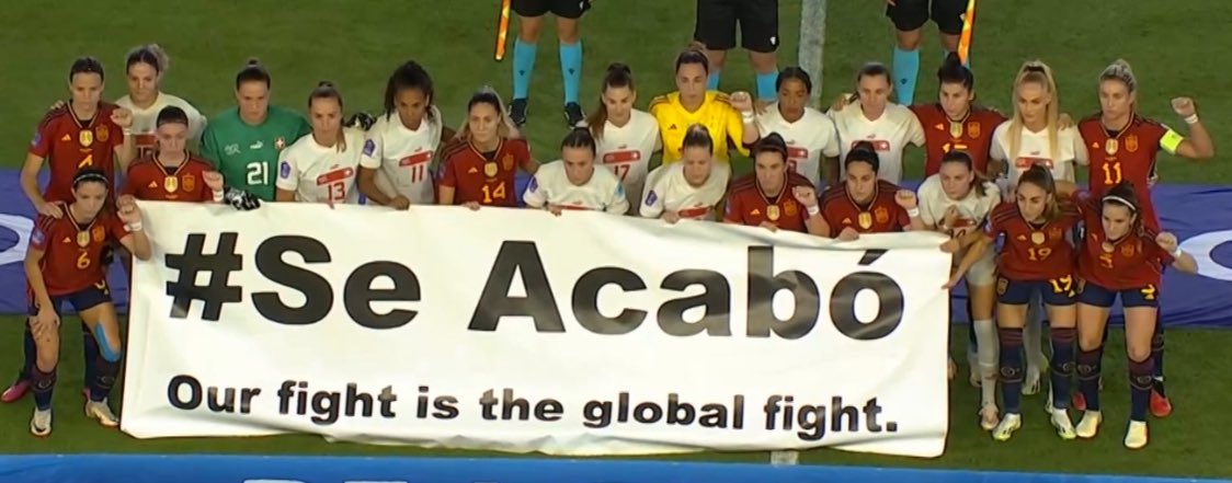 De nuevo y por segundo partido consecutivo, las jugadoras de la selección española se unen con su rival, en este caso Suiza, para posar antes del inicio del partido con la pancarta con el lema Se Acabó, en defensa de sus derechos y en plena lucha con la RFEF.
