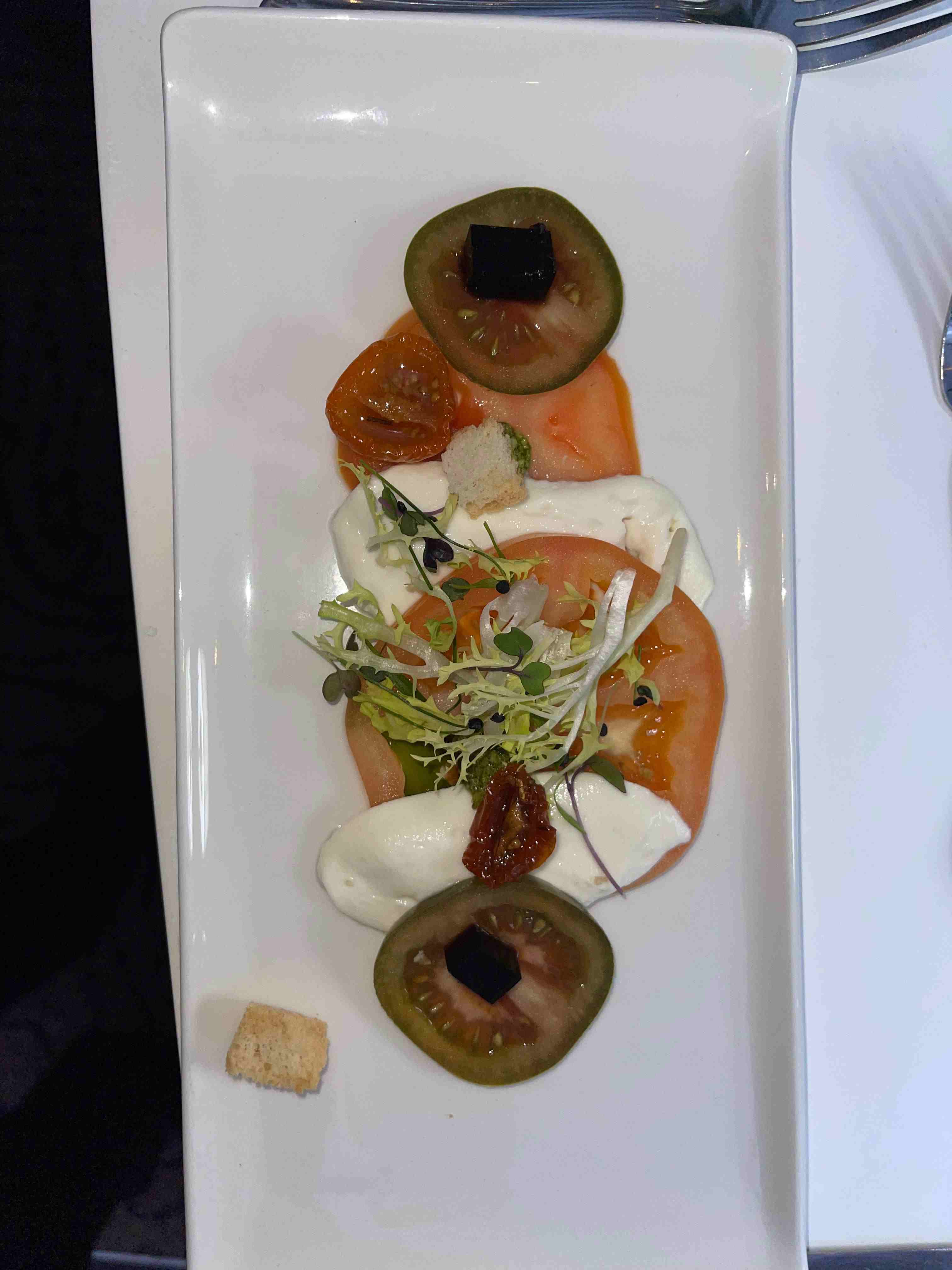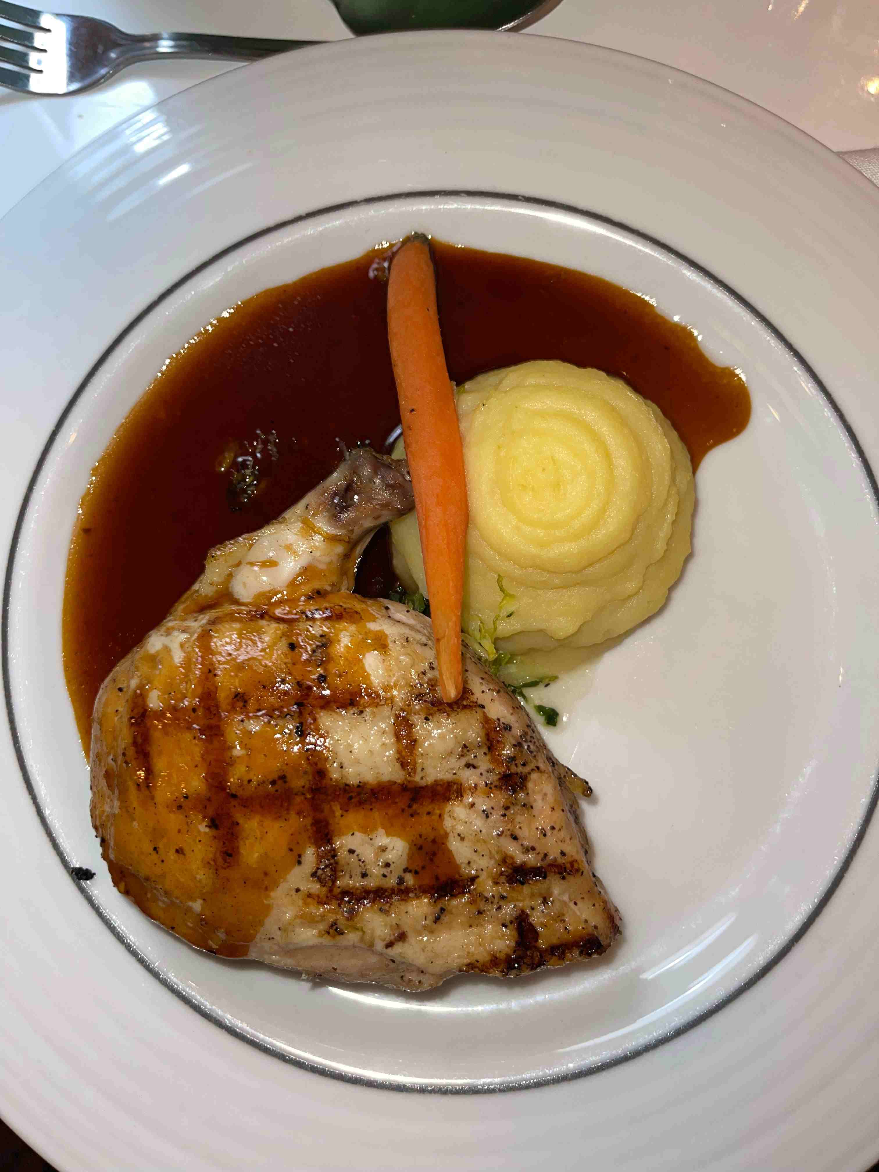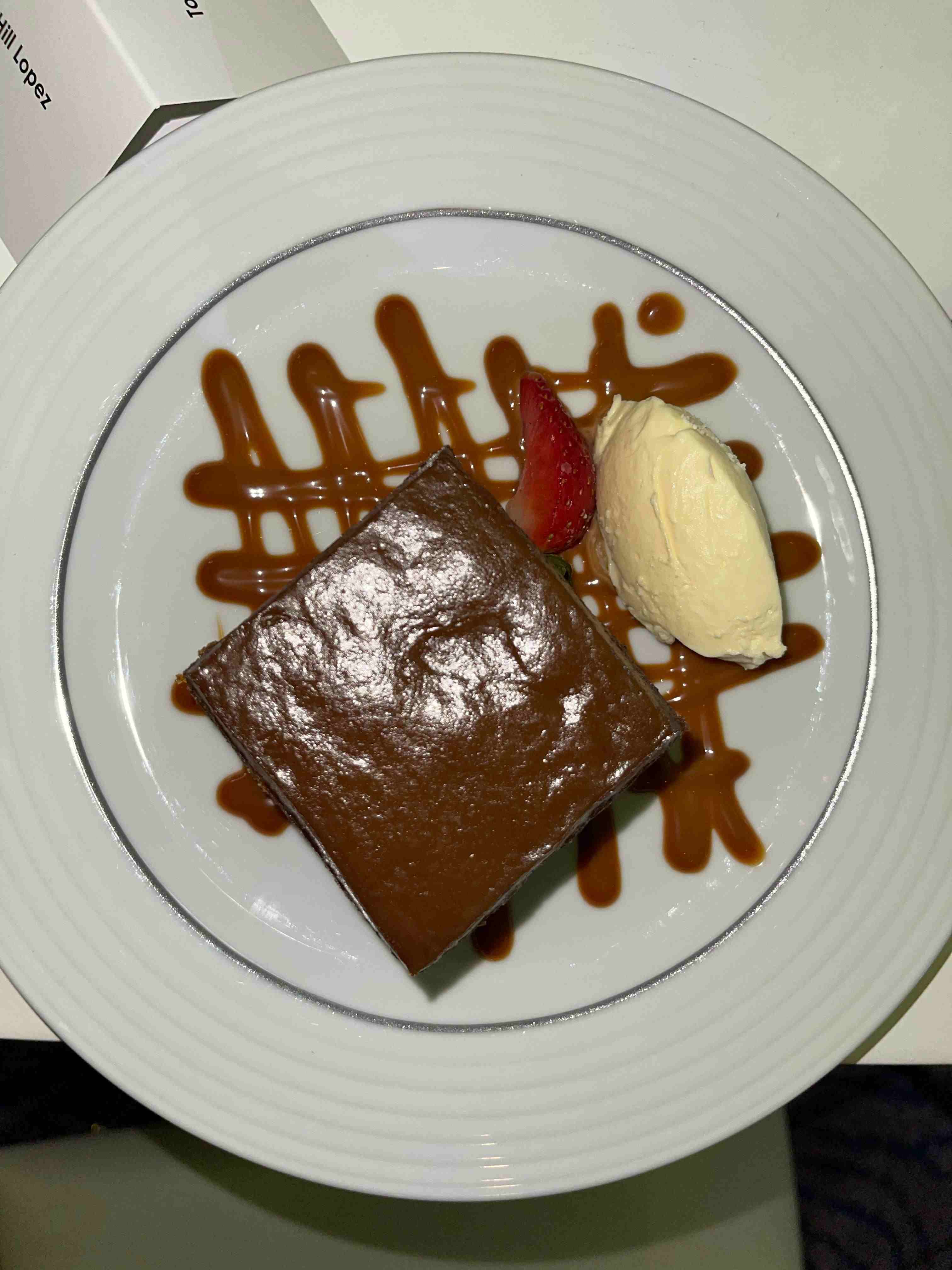 Uno de los menús constaba de pastel de eglefino –pescado típico de la gastronomía británica–, tortellini de espinacas y ricotta y una panna cotta de coco. El otro, que aquí les mostramos, no fue ni mucho menos contundente, aunque en teoría lo parecía. El primer plato se trataba de una ensalada de tomate, limitada a apenas unas finas rodajas y un poco de mozzarella por encima. El segundo plato era una pechuga de pollo asada acompañada de patata y zanahoria que, igualmente, se quedaba en nada. Sí que era más contundente el postre, un puding con salsa de caramelo.