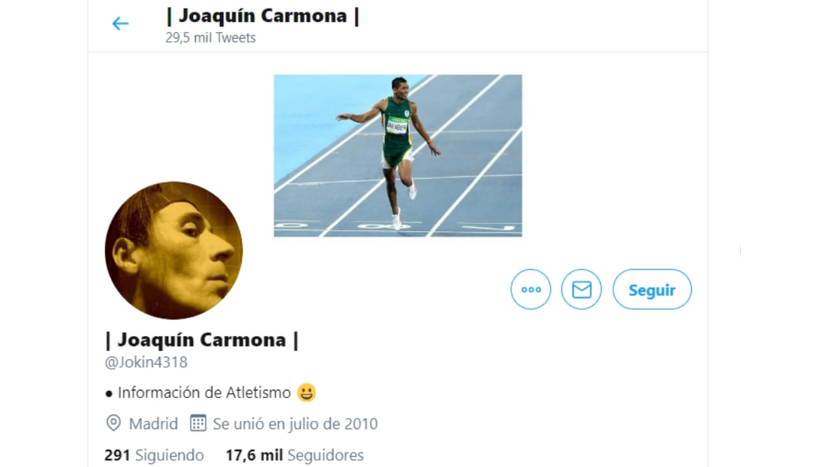 La historia de Joaquín Carmona da mucho que pensar. Con 17.700 seguidores en Twitter, este catalán es según muchos el mayor experto del mundo del atletismo en la citada red social. Pero lleva tres meses sin actualizar su perfil, sin publicar nada. Y el motivo es estremecedor. Joaquín Carmona es un indigente, una persona sin hogar que duerme en un parque de Madrid y que por tanto durante el confinamiento no ha podido ni encender su viejo ordenador ni conectarse a Internet.