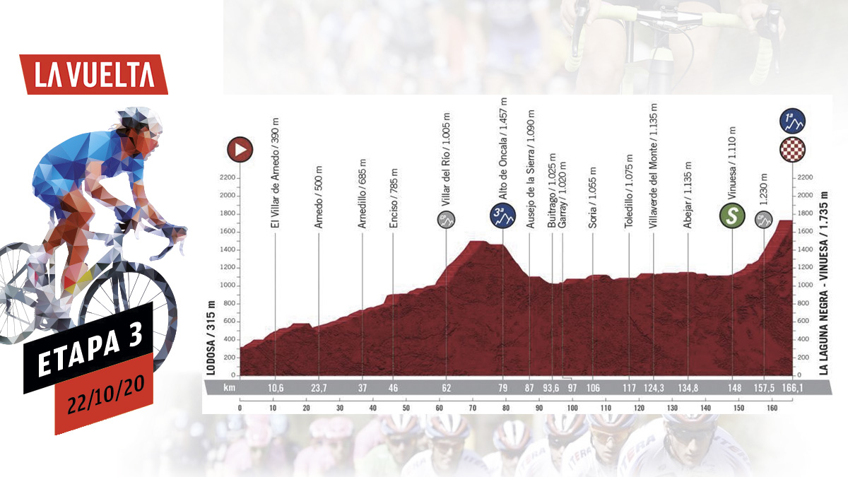 La etapa 3 de la Vuelta a España arranca en Lodosa y finaliza en la Laguna Negra de Vinuesa, llegada inédita en la Vuelta. 166 kilómetros que finalizan con un puerto de primera categoría sólo apto para los más fuertes