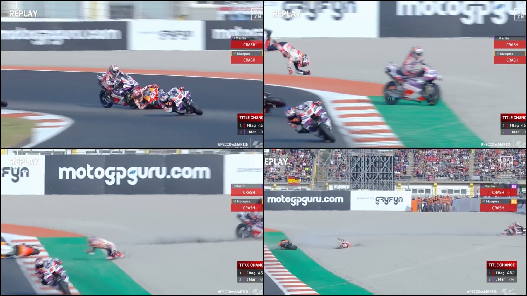 En el transcurso de la remontada, Jorge Martín se volvió a pasar en una curva y se tocó con Marc Márquez protagonizando un accidente espectacular en el que el piloto de Honda voló de forma espectacular. Con este abandono, Bagnaia se proclamaba campeón del Mundo de MotoGP. Después del impacto, Marc Márquez, que salió de la pista con señales de dolor, se marchó al centro médico con el objetivo de realizar las primeras exploraciones después del gran impacto sufrido.