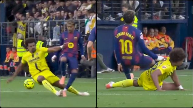 Alberola Rojas lo ha vuelto a hacer. Corría el minuto 39 del Villarreal-Barcelona cuando el árbitro expulsó a Renato Veiga con roja directa por una entrada por detrás a Lamine Yamal. El extremo del Barcelona recibió un balón en medio campo y cedió para otro compañero de primeras. El central portugués del submarino amarillo llegó tarde e impactó abajo con el pie del español, en una entrada bastante dura.