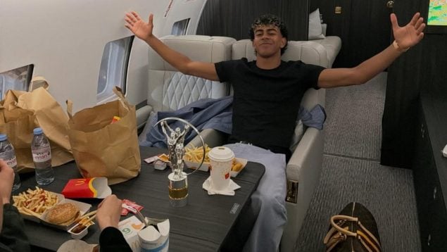 Lamine Yamal celebra el Laureus con un festín de comida rápida en su avión privado