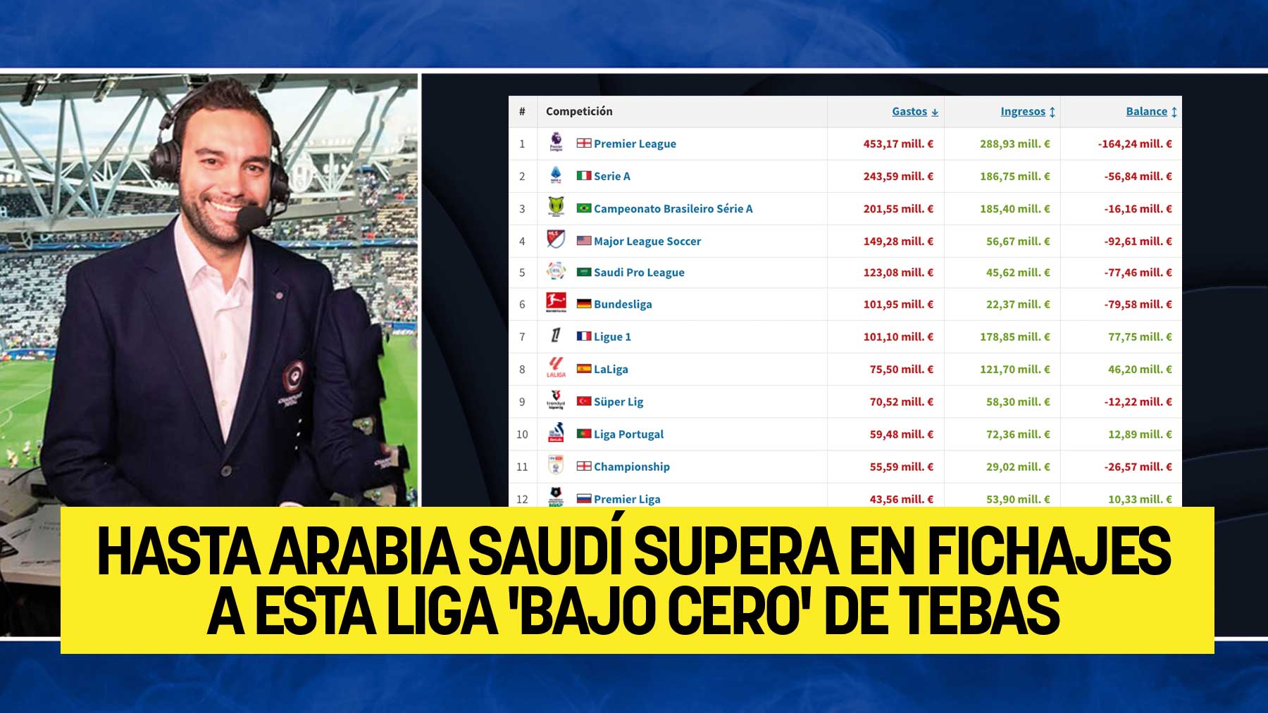 Era previsible, a tenor de las últimas temporadas, ver como los torneos de otros países como Brasil, EEUU y Arabia Saudí adelantaban a la Liga por la derecha. Esta última además, desplaza a la Liga hasta la quinta plaza del ranking total de la presente temporada. Una campaña donde España sólo aventaja a Francia en 20 millones de euros en fichajes y, de seguir en la misma tendencia, podría llegar a ser la peor de las cinco grandes ligas de Europa. De hecho compite con la Ligue 1 gala en este momento, en lo que a gasto en fichajes se refiere, y lejos ya de Alemania, Italia y la Premier.