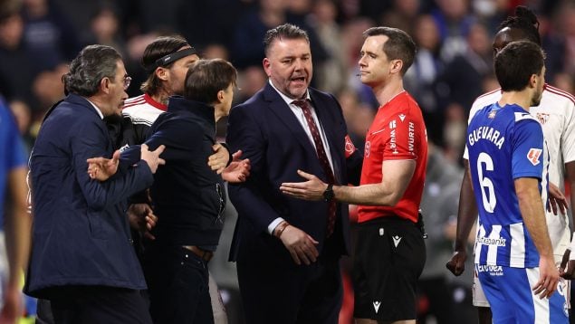 Matías Almeyda ha vuelto a liarla al ser expulsado con el Sevilla. Después de su enfrentamiento con Cuadra Fernández y la asistente Guadalupe Porras, el entrenador del conjunto hispalense ha vuelto a tener un encontronazo con los árbitros. Esta vez, con Galech Apezteguía durante el partido contra el Alavés. El colegiado le expulsó tras quejarse con aspavientos por una falta pitada sobre el conjunto vitoriano. La reacción fue de lo más brusca. Se encaró con él preguntándole por qué le echaba y, tras varios minutos, se fue a por el cuarto árbitro, terminó dándole una patada a una botella y empujando a un miembro de seguridad del propio club.