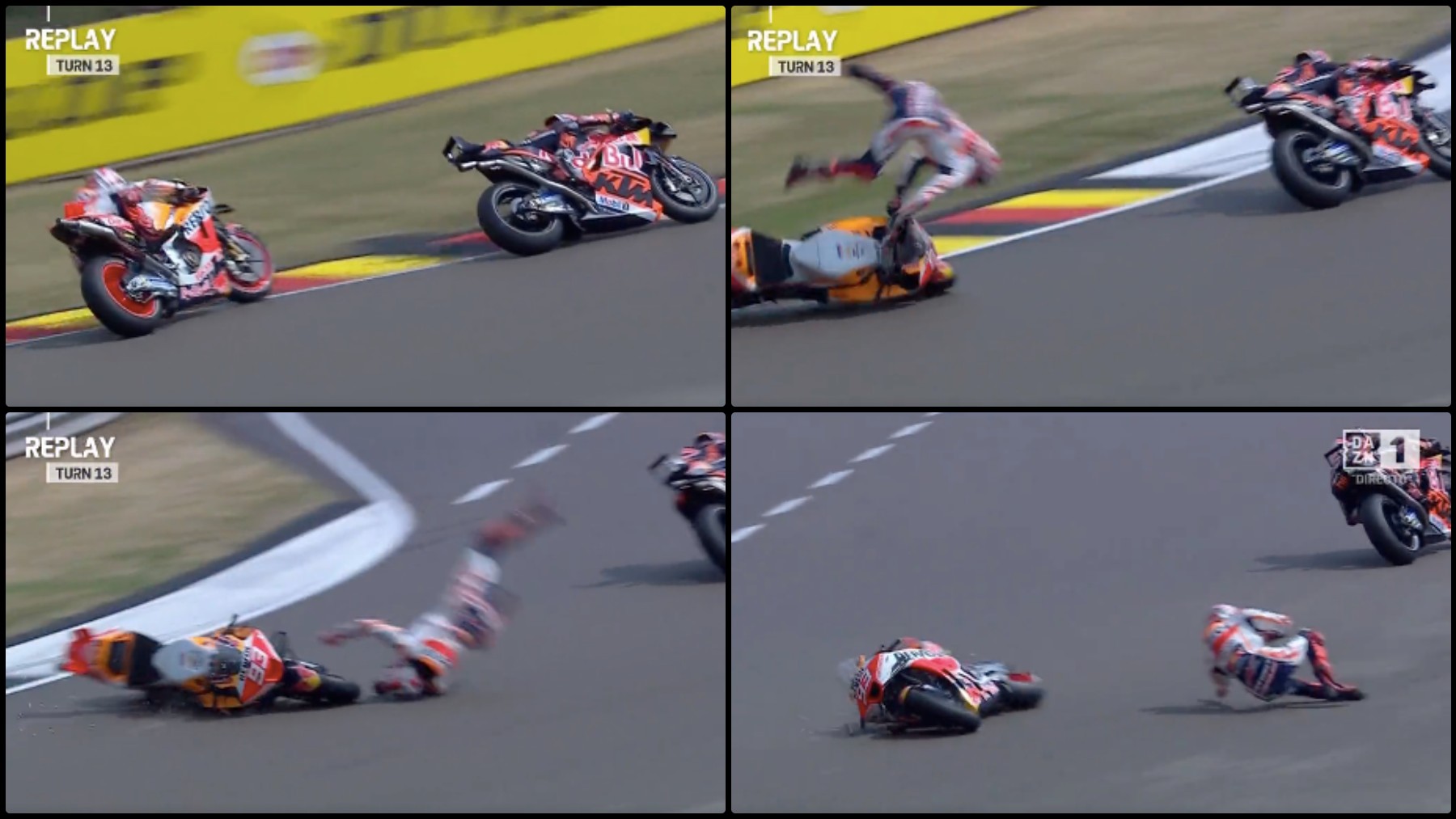 Marc Márquez sufrió una espeluznante caída en la sesión de clasificación del GP de Alemania de MotoGP. El ocho veces campeón del mundo tuvo un fuerte accidente e incluso se marchó cojeando tras salir volando por los aires. Por fortuna, no fue nada grave y pudo volver a la pista minutos después.