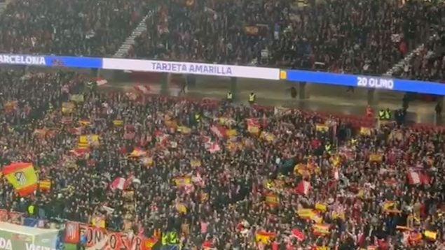 Fiesta rojiblanca en el Metropolitano. La goleada del Atlético de Madrid al Barcelona, con una histórica humillación en Copa del Rey, se celebró con gritos de «¡viva España!» en la grada del Metropolitano. Los aficionados colchoneros sacaron sus banderas de España y entonaron estos cánticos en la segunda mitad, cuando ya su equipo iba ganando por 4-0, todos los goles en la primera parte.