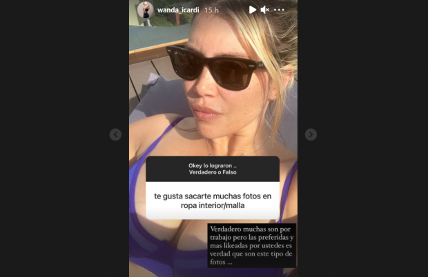«Te gusta sacarte muchas fotos en ropa interior/malla», fue la pregunta de uno de sus ‘followers’, a lo que Wanda Nara respondió lo siguiente a través de una ‘story’ de Instagram: «Verdadero. Muchas son por trabajo pero las preferidas y más ‘likeadas’ por ustedes es verdad que son este tipo de fotos…».