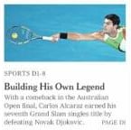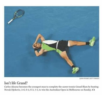 Los medios de comunicación más prestigiosos de Estados Unidos dedican espacio en sus portadas a la hazaña del español. «Alcaraz Slams (referencia al gran torneo) Djokovic», dice The Wall Street Journal. «Construyendo su propia leyenda», reza el titular de The New York Times. «¿Isn’t life Grand (¿No es grande la vida?», publica The Washington Post.