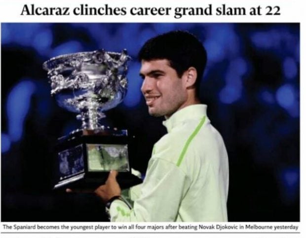 La prensa internacional se rinde este lunes a Carlos Alcaraz tras su hazaña cosechada en la final del Open de Australia al vencer a Novak Djokovic y convertirse en el jugador más joven de la historia en completar el Grand Slam (Roland Garros, Wimbledon y US Open). Las principales cabeceras del mundo hacen un gran hueco en sus portadas al tenista español con titulares como este tan impactante de The Times: «Su leyenda en el tenis está en proceso de escritura».