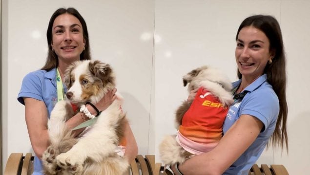 La cachorra iba ataviada con una camiseta del equipo español de atletismo