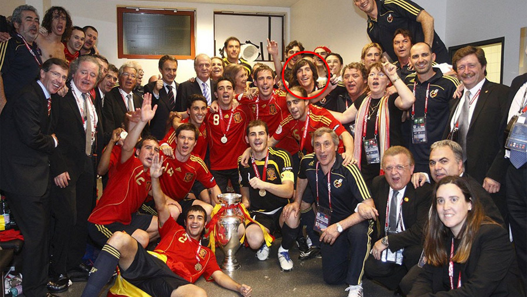 Javier Enríquez Romero aparece en la foto de familia tomada en el vestuario junto a los integrantes del equipo, los altos cargos de la RFEF, con el entonces presidente del Gobierno Rodríguez Zapatero, los Reyes y la infanta Elena. En el centro, la copa que España acababa de conseguir tras imponerse en la final a Alemania y también un Xavi Hernández que quiso desmarcarse de toda la polémica al afirmar que el escándalo se produjo en un momento en el que él no estaba en el Barça.
