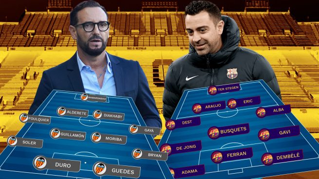 José Bordalás cuenta con dos bajas, la de Cillessen y Correia, para este partido. El resto está disponible y en principio se espera un once inicial de garantías por parte de los che. Guedes y Hugo Duro son la pareja de moda valencianista en el frente de ataque por su versatilidad y velocidad, serán incómodos para la zaga culé. Bryan Gil, Carlos Soler, Guillamón y un viejo conocido como Ilaix Moriba, ocupan el medio.