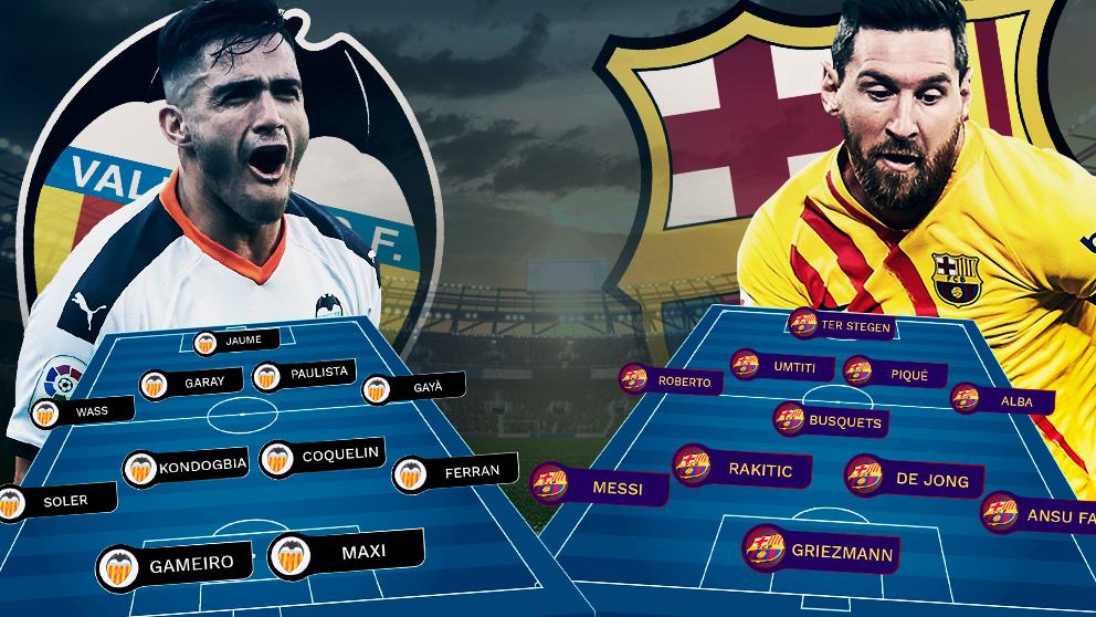 A diferencia de en Copa, donde Messi, Piqué y Busquets se quedaron en Barcelona, Setién sí que se los llevará a Mestalla. Lógicamente, serán de la partida los dos, junto a De Jong, que tras no ser titular en el debut del cántabro en el banquillo, partirá con total seguridad de inicio. El equipo quedaría conformado por: Ter Stegen; Roberto, Piqué, Umtiti, Alba; Busquets, Rakitic, De Jong; Ansu Fati, Griezmann y Messi.