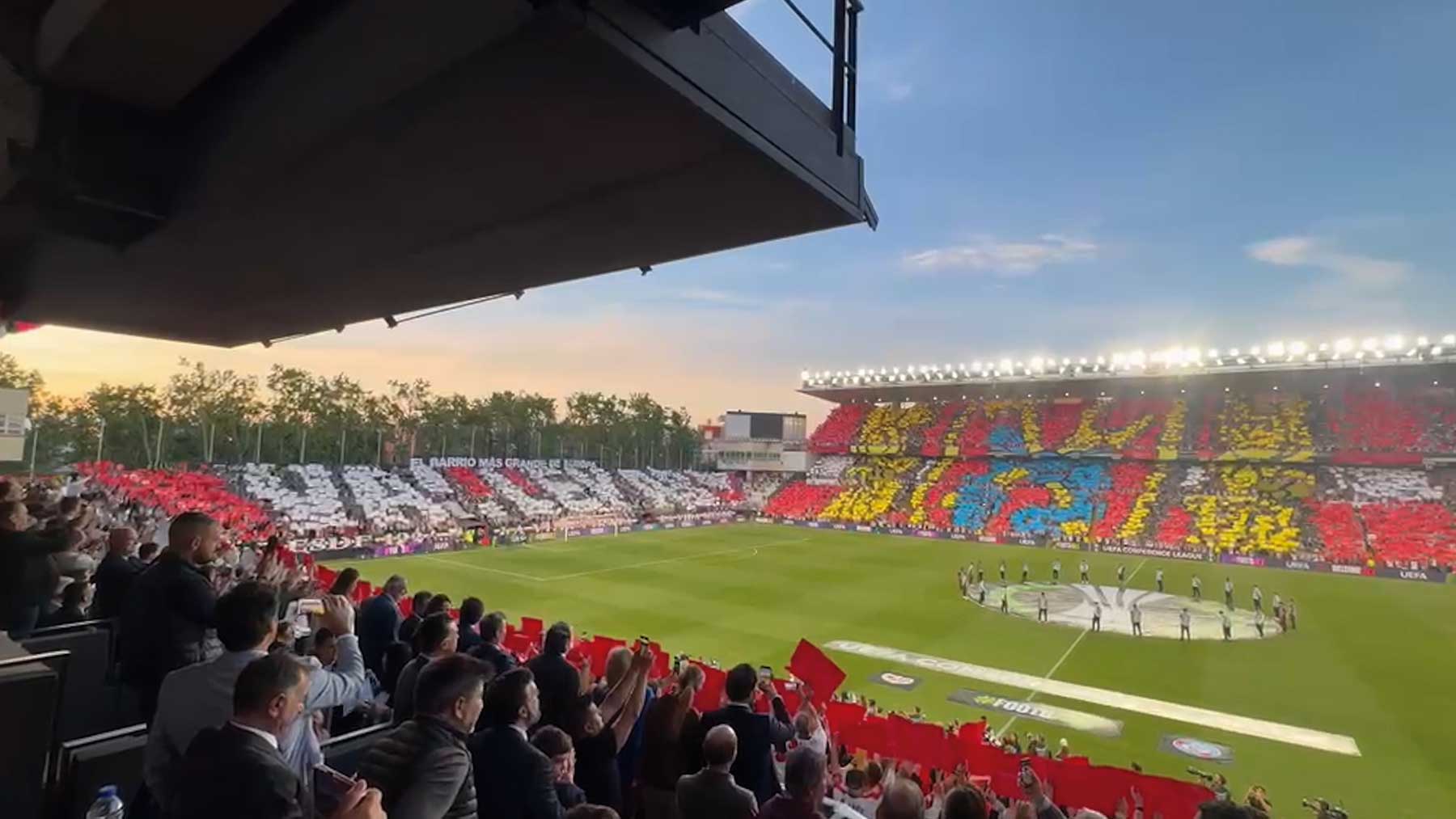 Noche histórica en Vallekas, en la ida de las semifinales de la Conference League. Un partido que toda la afición del Rayo Vallecano llevaba una vida esperando. Enfrente, el Estrasburgo francés, el mejor equipo de la fase de liga, contra el que se iban a jugar su presencia en Leipzig. Y si la afición del conjunto madrileño estuvo espectacular al recibir al equipo, sobresalió cuando sus jugadores saltaron al césped. El mosaico que cubría la totalidad del viejo estadio de Vallecas fue impresionante.