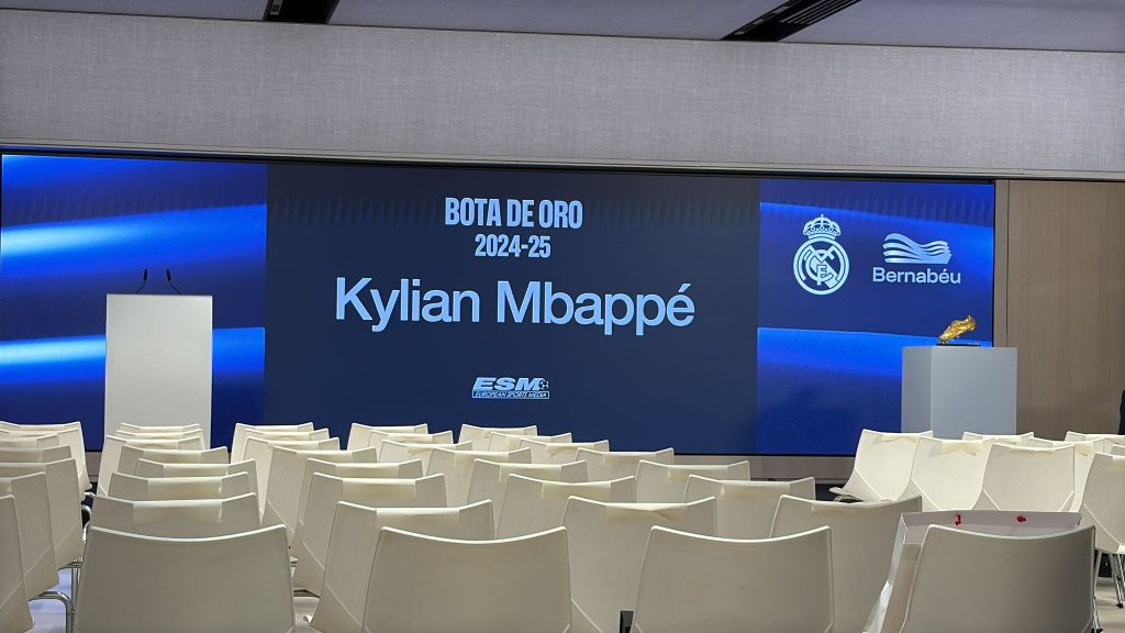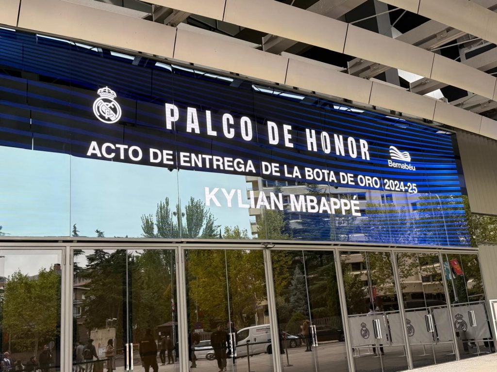 En cinco minutos está previsto que arranque el acto en el Bernabéu en el que Mbappé recogerá su Bota de Oro. El premio ya se muestra en el palco de honor.