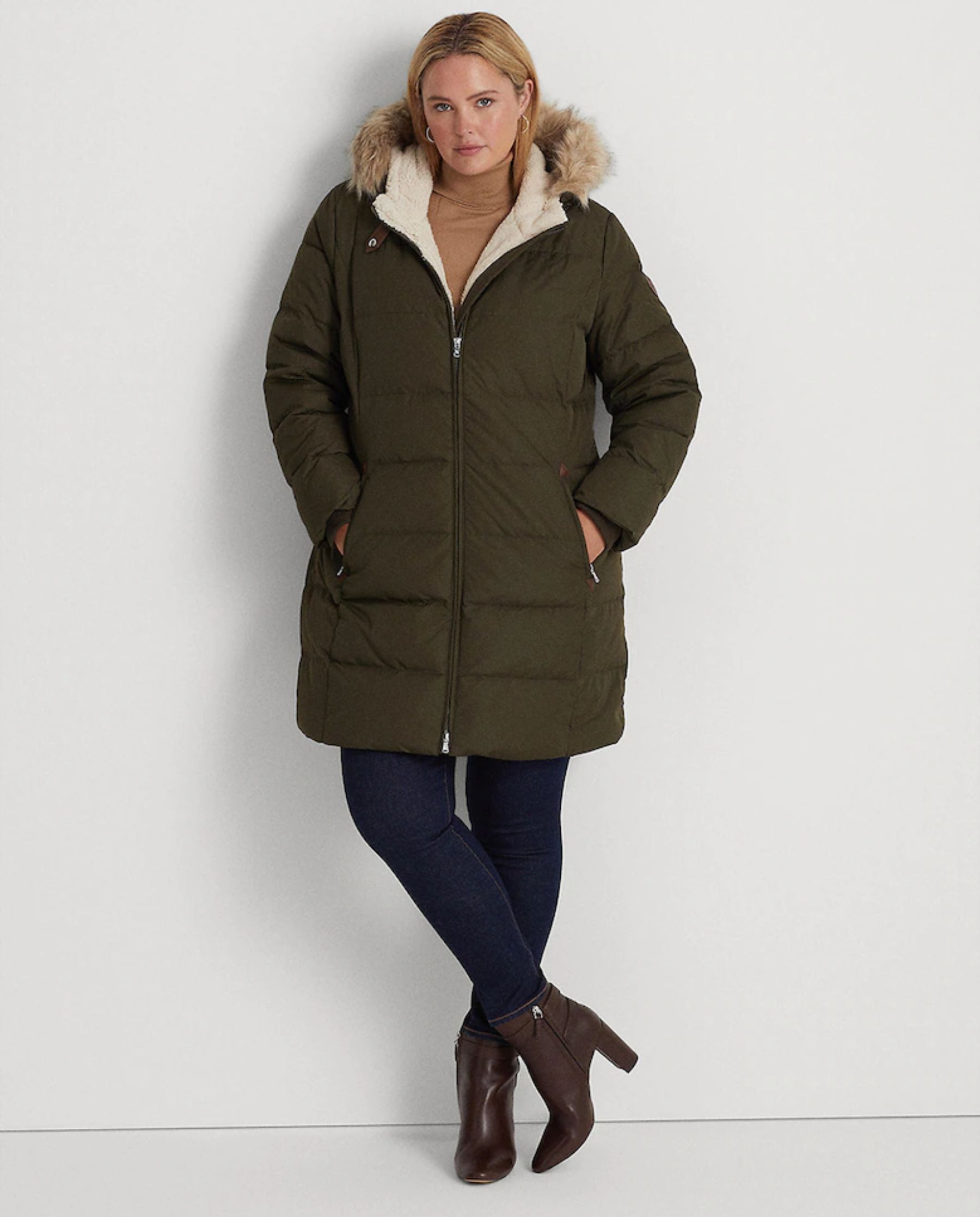 El segundo es un abrigo acolchado, de la sección Woman, Ralph Lauren dedicado a tallas grandes. Un abrigo tres cuartos acolchado de un acertado verde militar y además con capucha de pelo. Su precio ha pasado de los 319 euros a los 223,30 euros.