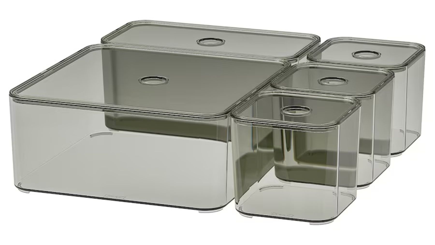 Este set de cajas con tapa se llama VISSLAÅN y cuesta solo 9,99 €. Son cinco cajas en total, de distintos tamaños pero perfectamente combinables y apilables. Están hechas de plástico transparente en tono gris oscuro, que no solo le da un toque moderno, sino que permite ver qué hay dentro sin necesidad de abrirlas.
