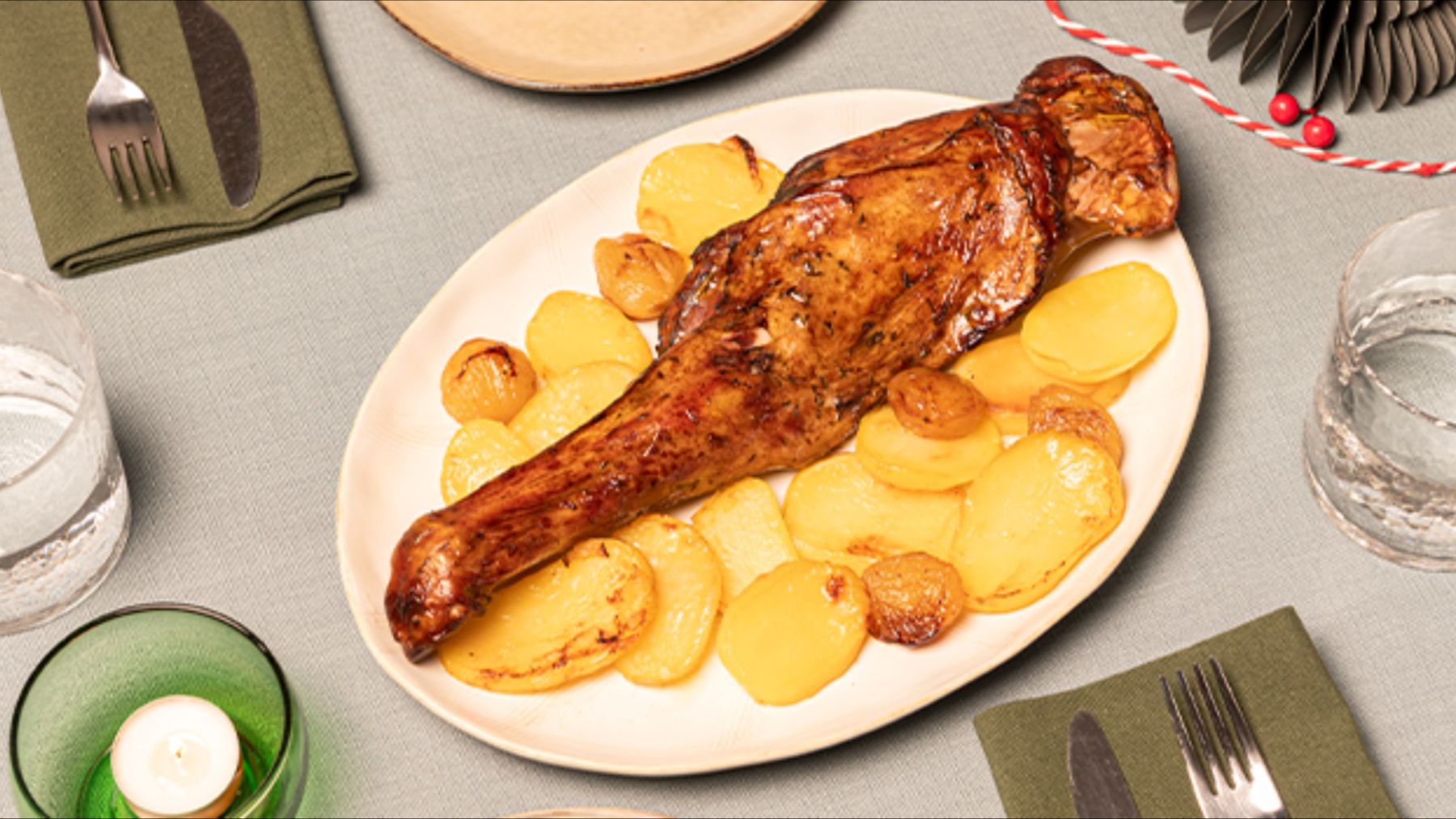 El plato estrella, como cada año, es el ¼ de cochinillo asado. Está pensado para dos personas y cuesta 50 euros, una cifra que sigue resultando más competitiva que muchos asadores. Lo acompañan patatas panadera y cebollitas confitadas, y el toque final lo pones tú en el horno, con unos 20 minutos de grill para conseguir la piel crujiente.