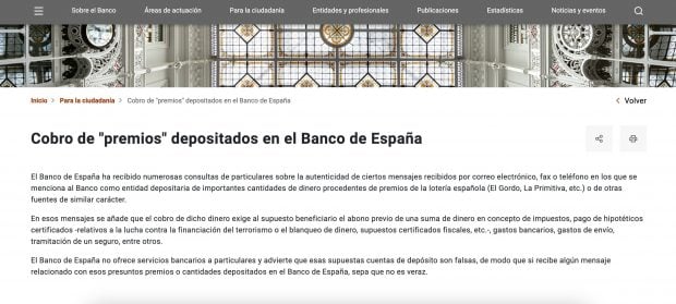 «El Banco de España ha recibido numerosas consultas de particulares sobre la autenticidad de ciertos mensajes recibidos por correo electrónico, fax o teléfono en los que se menciona al Banco como entidad depositaria de importantes cantidades de dinero procedentes de premios de la lotería española (El Gordo, La Primitiva, etc.) o de otras fuentes de similar carácter», comienza diciendo el Banco de España emitido a través de su página web.