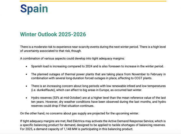 Desde Europa también han avisado sobre «las indisponibilidades planificadas de centrales térmicas que tienen lugar entre noviembre y febrero, combinadas con varias averías forzadas de larga duración que afectan a las plantas de ciclo combinado». «Crece la preocupación por largos periodos con baja producción renovable y bajas temperaturas, que pueden afectar a grandes áreas de Europa, como ocurrió el invierno pasado», reza el informe.