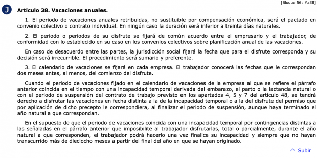 El artículo 38 del Estatuto de los Trabajadores recoge la relación entre empresa y trabajador en lo que respecta a las vacaciones anuales. «El periodo de vacaciones anuales retribuidas, no sustituible por compensación económica, será el pactado en convenio colectivo o contrato individual. En ningún caso la duración será inferior a treinta días naturales», dice el punto número 1, y en el 2 deja claro que este periodo de vacaciones se fijará de «común acuerdo entre el empresario y trabajador».