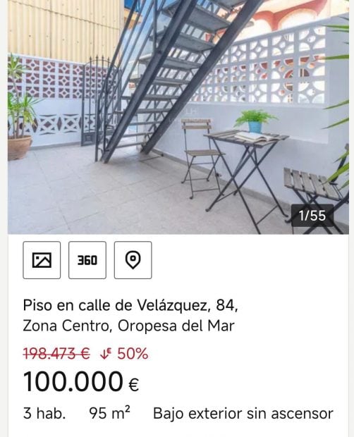 Sin ir más lejos, este periódico se ha puesto en contacto con una agencia inmobiliaria de Castellón que ofertaba en Idealista una vivienda al 50% de descuento. La casa baja de 95 metros cuadrados y 3 habitaciones había pasado de costar 198.473 euros a venderse por tan solo 100.000 euros, un auténtico chollo. Sin embargo, tras cuestionar la rebaja a la compañía intermediaria, esta reconocía que se trataba de una sola vivienda que finalmente habían dividido en dos apartamentos, un bajo y una primera planta. Algo muy diferente a lo que rezaba el anuncio: «Esta espaciosa casa de dos plantas, junto con un amplio patio, ofrece una oportunidad única (…)», recogía el anuncio.