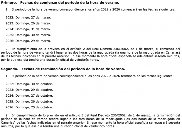 Este cambio de hora del 30 de marzo de 2026 está publicado en el Boletín Oficial del Estado a través de la Orden PCM/186/2022, de 11 de marzo, por la que se publica el calendario del período de la hora de verano correspondiente a los años 2022 a 2026, y donde se informa que las fechas de comienzo del período de la hora de verano serán el domingo 29 de marzo y la fecha de terminación del período de la hora de verano será el domingo 25 de octubre de 2026.