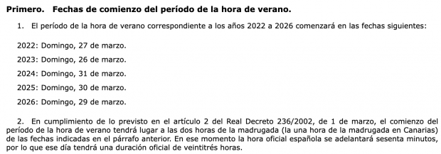 El cambio de hora en España está regido a través de la Orden PCM/186/2022, de 11 de marzo, por la que se publica el calendario del período de la hora de verano correspondiente a los años 2022 a 2026. Este texto publicado en el Boletín Oficial del Estado informa de la fecha del comienzo del periodo de la hora de verano durante este tramo de tiempo. Así que la ley informa que el sábado 28 y el domingo 29 de marzo a las 02.00 horas serán las 03.00 horas.