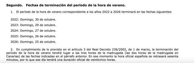 En el Boletín Oficial del Estado también se detallan las fechas de terminación del periodo de la hora de verano, que en 2026 finalizará el domingo 25 de octubre, en el que se atrasarán los relojes y España volverá al horario de invierno. Esta podría ser la última vez que se cambia la hora en España, según pretenden desde el Ejecutivo. En caso de seguir con el cambio de hora, tendrán que legislar al respecto.