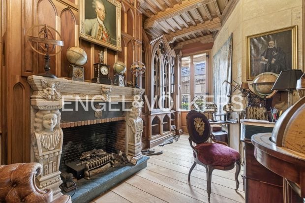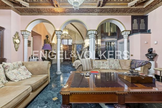 Desde la entrada principal se accede a un impresionante salón con techos abovedados, pilares de mármol y una gran chimenea que actúa como eje central del espacio. La vivienda cuenta además con ascensor, lo que facilita la conexión entre las seis plantas.