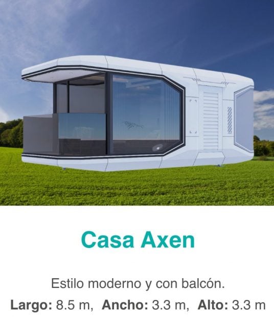 En la página web de Caslua Import se pueden ver las varias casas cápsula que ofrecen, como la casa Axen, que cuenta con un estilo moderno e incluso con balcón. «Permite dividir en zonas funcionales como dormitorio, sala de estar y baño», informa la página web sobre una casa cápsula que «cuenta con vidrio doble aislante, ventanas panorámicas de 270° y tragaluces, con un diseño futurista y tecnológico que brinda una experiencia espacial única». El precio fijado es desde 63.500 euros, que puede llegar hasta los 80.000, según los complementos elegidos.
