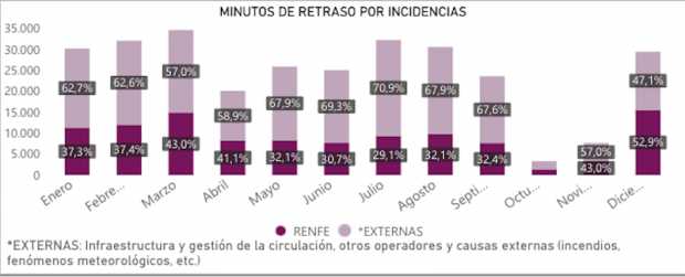 En este caso, sí que se observa en el informe que durante el mes de diciembre ya se habían detectado un par de incidencias externas, es decir, el estado de las infraestructuras que estaban afectando a la puntualidad de los trenes. No obstante, en el mes de noviembre también se pueden ver unos valores altos, con un 57% de las incidencias que son el resultado de causas externas, mientras que un 43% se debe a Renfe.