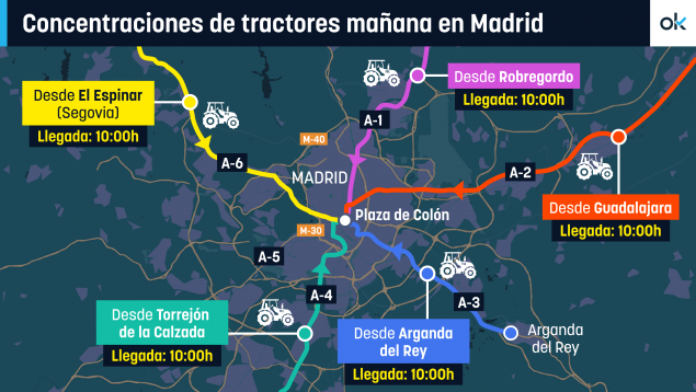 Cinco columnas compuestas por más de 1.500 tractores provenientes de toda España colapsarán las entradas a Madrid el miércoles. Así, los agricultores protestarán por el pacto entre la Unión Europea (UE) y Mercosur y por la nueva Política Agraria Común (PAC) que elabora Bruselas. Los trabajadores del campo llevan días trasladándose a la capital, sobre todo aquellos que proceden de las zonas más alejadas del país. Ahora, se concentran en cinco puntos desde los que partirán mañana hacia la ciudad capitalina.