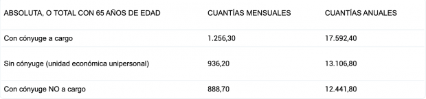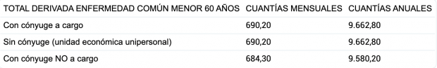 Por su parte, la pensión mínima de incapacidad permanente total derivada de enfermedad común para menores de 60 años quedará en 690,20 euros para los pensionistas con cónyuge a cargo. Sin cónyuge, bajará; será la misma cantidad y, en los casos de cónyuge no a cargo, será de 684,30 euros.