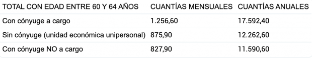 La pensión por incapacidad permanente total con edad de entre 60 y 64 años quedará, en caso de tener cónyuge a cargo, en 12.566,60 euros. Sin cónyuge se quedará en 875,90 euros y con cónyuge no a cargo será de 827,90 euros, que son 11.590,60 euros anuales.