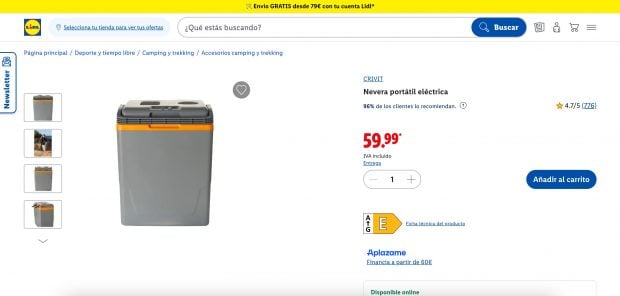 Lidl informa que el precio de esta nevera portátil es de 59,99 euros y la entrega será en menos de una semana. También se ofrece una devolución gratuita en un periodo de 30 días. «A los pocos minutos de enchufarlo a una toma de corriente de 230 V, la temperatura interior bajó a 4 °C. Todavía no lo he probado en el coche, pero los resultados son prometedores. Además, el frigorífico es muy espacioso. Creo que funcionará bien», dice una de las personas que ha valorado este producto en la página web oficial de Lidl.