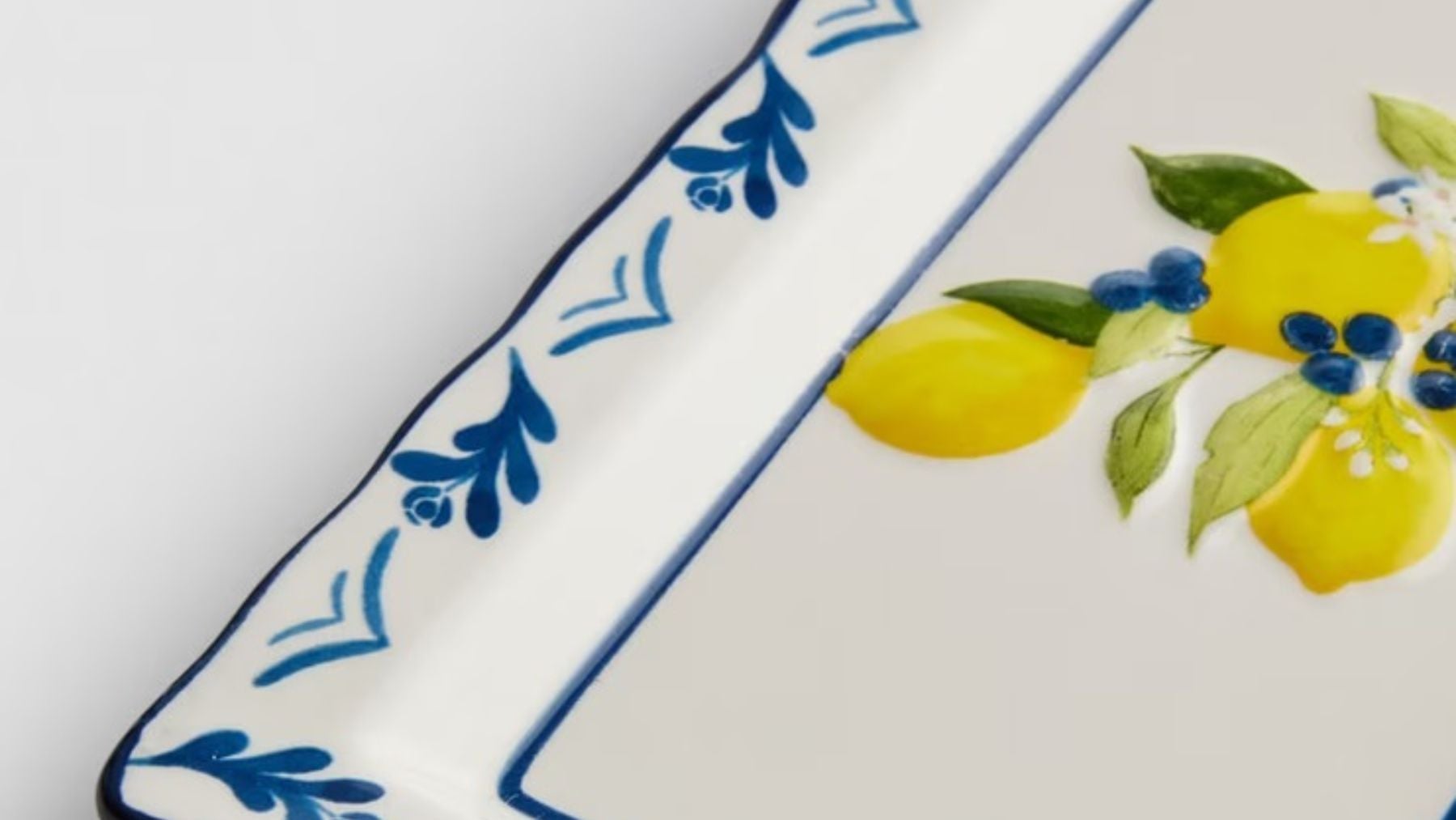Este plato rectangular de Primark apuesta por un diseño muy reconocible, con base blanca y un borde en tonos azules que enmarca la pieza sin recargarla, mientras que en el centro aparecen los limones con hojas verdes y pequeños detalles en azul que terminan de darle ese aire mediterráneo que tanto se busca en este tipo de vajilla.