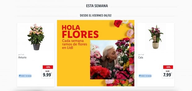 Desde este viernes 6 de febrero, en Lidl se pueden encontrar descuentos de hasta el 38% en la planta Calathea, que baja hasta los 7,99 euros. También hay otros del 33% en la planta Anturio, que pasa de 14,99 euros a 9,99 euros, y la planta Cala, que se puede comprar a 7,99 euros. La empresa de origen alemán también informa sobre los establecimientos en los que se pueden adquirir estos productos con motivo del Día de San Valentín.
