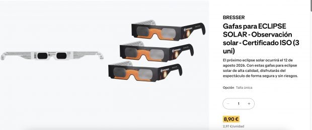 «El próximo eclipse solar ocurrirá el 12 de agosto 2026. Con estas gafas para eclipse solar de alta calidad, disfrutarás del espectáculo de forma segura y sin riesgos», se puede leer en el encabezado principal de Decathlon sobre estas gafas solares que tienen un precio de 8,90 euros en un pack de tres unidades, saliendo a 2,97 euros la unidad.