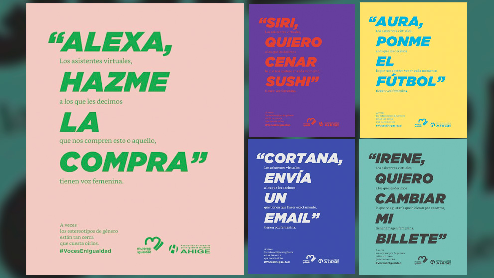 Desde AHIGE aseguran que estos aparatos reproducen estereotipos de género asociados a la mujer: «tradicionalmente, en nuestra sociedad, tienen un rol servicial, pasivo, complaciente. Por el contrario, a los hombres se nos asocian papeles de autoridad, mando, ejecución. Esto no es natural, no es biológico, es producto de unas relaciones de género que solo se han empezado a poner en cuestión en las últimas décadas. Y todavía no han calado, está claro».