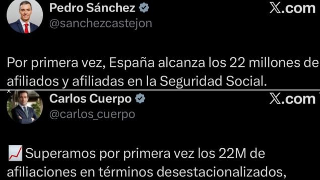 Sin embargo, su ministro de Economía, Comercio y Empresas y recientemente nombrado vicepresidente primero del Gobierno, Carlos Cuerpo, ha corregido públicamente a Sánchez advirtiendo en su cuenta de X que se trata de «22 millones de afiliaciones en términos desestacionalizados».