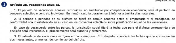 El Estatuto de los Trabajadores habla sobre ello en su artículo 38, que hace referencia a las «vacaciones anuales». «El periodo de vacaciones anuales retribuidas, no sustituible por compensación económica, será el pactado en convenio colectivo o contrato individual. En ningún caso la duración será inferior a treinta días naturales», dice el punto 1 de este artículo en el que se manifiesta que: «El periodo o periodos de su disfrute se fijará de común acuerdo entre el empresario y el trabajador, de conformidad con lo establecido en su caso en los convenios colectivos sobre planificación anual de las vacaciones».