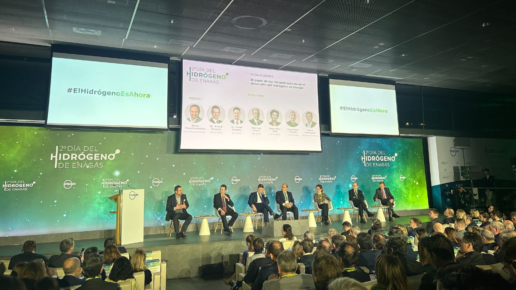 En esta jornada, el 2º Día del Hidrógeno de Enagás, se han dado cita instituciones, empresas y expertos de referencia en el ámbito del hidrógeno renovable. Han contado con la ministra para la Transición Ecológica y el Reto Demográfico, Teresa Ribera; el vicepresidente ejecutivo de la CE, Maroš Šefčovič; junto al presidente de Enagás, Antonio Llardén, y su CEO, Arturo Gonzalo.