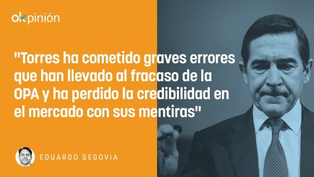 Si tu relato no es muy sólido, sólo te falta mentir para perder cualquier credibilidad. Y Torres lo ha hecho. Reiteró que no iba a subir el precio y lo subió; anunció que iban a llegar al 60-70% del capital, cifra que nadie sabe de dónde se sacó; incluyó en el folleto de la OPA sinergias durante los tres años en que no podía fusionarse, algo imposible como puso de manifiesto el consejo del Sabadell; y aseguró que no iban a renunciar a la condición de éxito del 50% y después abrió la puerta a bajarla hasta el 30%.